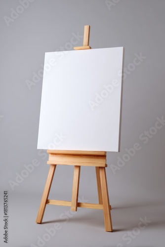 Blank white canvas on a wooden easel against a neutral gray background creating a clean minimal art studio scene perfect for design presentations and creative mockups