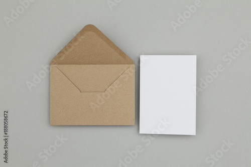 Blank white card with kraft brown paper envelope template mock up