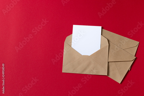 Blank white card with kraft brown paper envelope template mock up. Christmas wish list