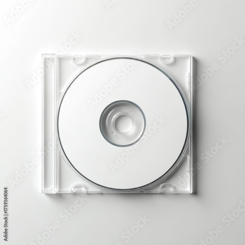 Blank white CD or DVD inside clear jewel case. Empty optical disc for data, music, or software. Minimalist product mockup for design, branding, or presentation.