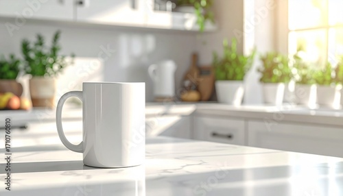 Blank white coffee mug sitting on a pristine marble kitchen counter, bathed in warm morning sunlight, creating a serene and inviting domestic scene