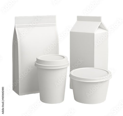 Blank White Food Packaging Pouch Carton Cup and Container.