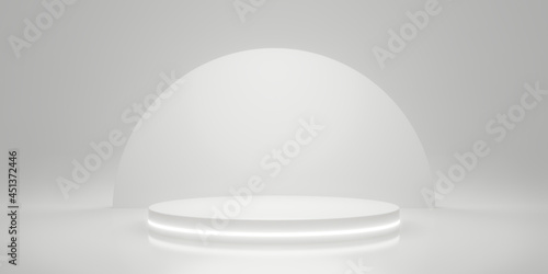 Blank white gradient background with circle glowing product display platform. Empty studio with podium pedestal on a white backdrop. 3D rendering