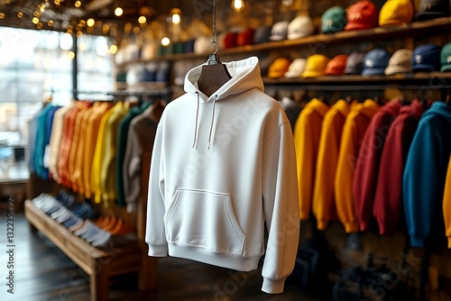 Blank White Hoodie Mockup in Trendy Clothing Store, Apparel Design Template