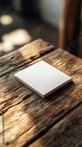 Blank white notepad on rustic wooden table in sunlit room