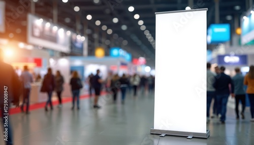banner, roll up, exhibition, tradeshow, event, display, marketing, advertising, racked, blank, template, hall, convention, conference, expo, crowd, people, business, branding, promotional, commercial, graphic, design, information, space, showcase, setup, presentation, audience, interaction, engagement, visibility, environment, white, empty, signs, vertical, public, blurry, background, corporate, product, service, message, promotion, communication, company, brand, strategy, sale