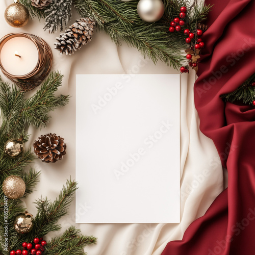 blank white sheet of paper, size 5x7 inches, placed on a table with ivory drapery and a red tablecloth. The decor includes green pine branches, pine cones, red berries