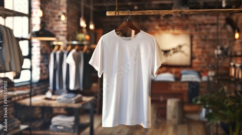 Blank white t-shirt hanging in store. A plain white tee hangs on a rack in a retail store, showcasing a versatile clothing option for various designs and styles.