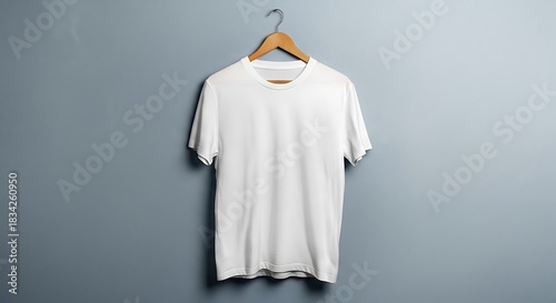 Blank white tshirt mockup on a wooden hanger, perfect for showcasing apparel designs, fashion, or casual wear