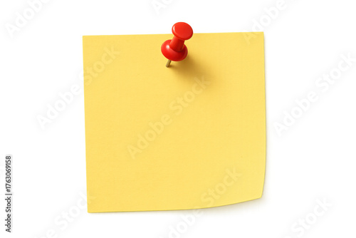 memo, reminder, paper, drawing pin, office supply, communication, message, blank, yellow, red, blank space, copy space, advertisement, announcement, information, important, list, notification, organise, planning, concept, corporate, business, workplace, school, education, study, desktop, wall, board, bulletin board, tack, stationery, empty, plain, clean, square, rectangular, object, isolated, cut-out, studio shot, closeup, topview, no people, single object
