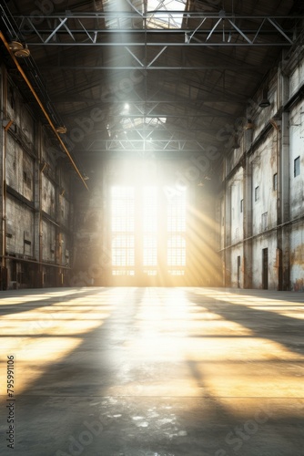 b'Large empty old factory building interior with bright sunlight shining through the big windows'