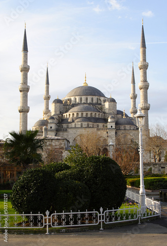 mosque, istanbul, turkey, church, building, architecture, islam, religion, cupola, minaret, lace, tower, fence, grass, bush, tree, heaven, blue, sultan, ahmed, tourist attraction, way