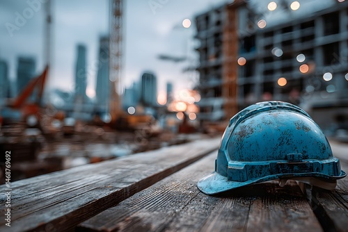 Blauer Bauhelm auf Holzbrettern vor moderner Stadtbaustelle