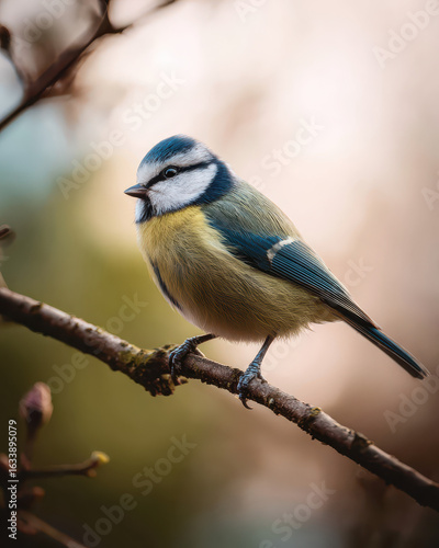 Blaumeise auf einem Ast minimalistische Komposition weiches Licht