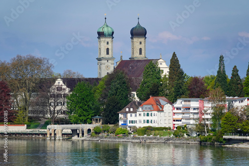 Blick über einen Teil von Friedrichshafen am Bodensee, mit Wohnhäusern, Bäumen und zwei Klostertürmen