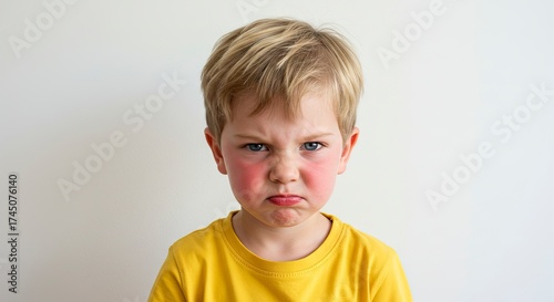 boy, children, blond, blond, hair, shirt, yellow, face, cheek, red, scowl, frown, angry, upset, annoyed, attitude, expression, children, young, looking, front, wall, white, background, portrait, closeup, indoor, childhood, youth, person, male, emotion, toddler, eye, lip, nose, mouth, head, shoulder, skin, bad, crabby, irritated, sulky, furious, sulk, moping, discontent