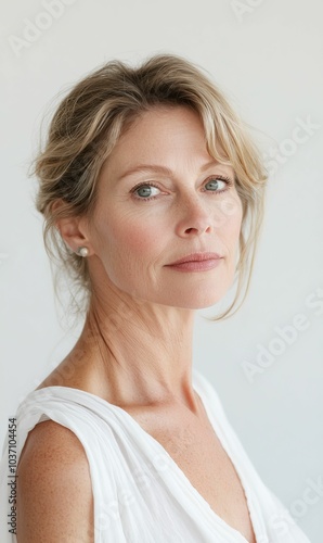 woman, female, portrait, blond, hair, face, eye, skin, wrinkle, ageing, natural, beauty, mature, adult, white, background, simple, elegant, fashion, model, studio, closeup, looking, serious, expression, thoughtful, earring, neckline, shoulder