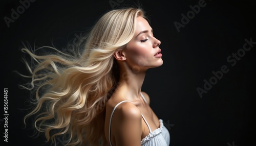 Blond woman with long flowing hair in profile on dark background. Light pink highlights, closed eyes. Hair flows, portrait of young, beautiful, serene girl.