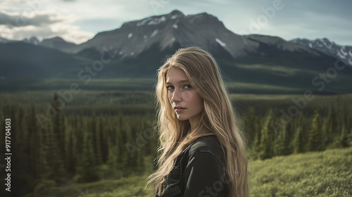 Blonde Canadian Woman Looking at the Camera While Hiking on a Mountain, Long Hair and Scenic Background Captured with Studio Lighting