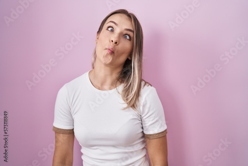 Blonde caucasian woman standing over pink background making fish face with lips, crazy and comical gesture. funny expression.