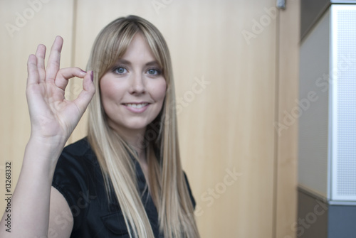 blonde geschäftsfrau zeigt ok zeichen mit hand und lacht