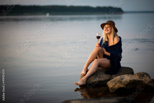 blonde girl in a hat with a glass of wine sitting on the riverbank, selective focus
