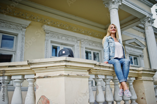 Blonde girl wear on jeans with backpack posed against vintage house.