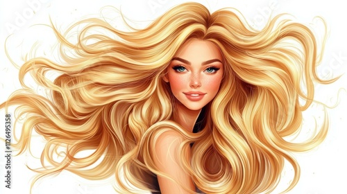 blonde girl with long and shiny wavy hair . Beautiful smiling woman model with curly hairstyle .