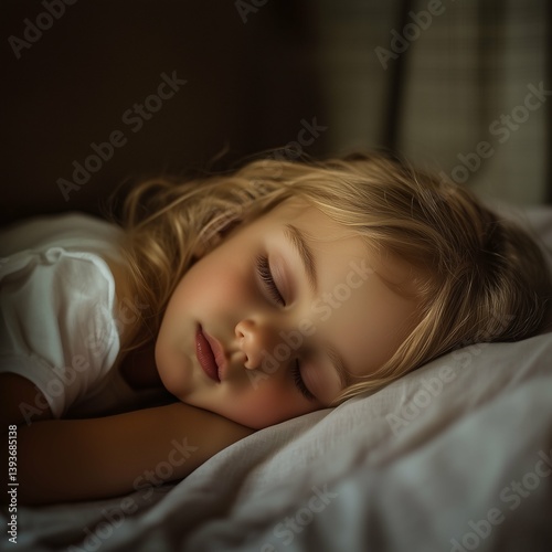 Blonde little girl sleeping in bed. lying asleep by night in bedroom. Square photo