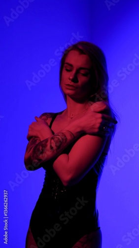 Blonde with a beautiful figure in a black patent leather bodysuit poses in a studio. Studio lighting, low exposure, monochrome red light