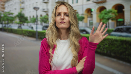 Blonde woman expressing frustration with crossed arms outdoors on a lively street with cars and buildings in the background.