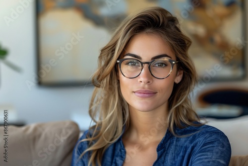 woman, female, portrait, eyeglass, goggles, blond, hair, looking, camera, casual attire, relaxed, smile, happy, confident, fashion, style, beautiful, attractive, face, eye, nose, lip, skin, eyebrow, eyelash, earring, jewellery, neck, shoulder, collar, shirt, denim, blue, clothes, sitting, couch, home, interior, wall, art, picture, background, lighting, natural, indoor, sharpened, sharp, clear