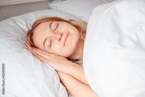Blonde young girl sleeping on a white pillow under a warm blanket in bed. Sweet dreams concept