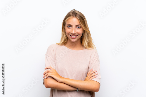 girl, woman, woman, people, person, lady, female, slim, youth, young, hispanic, caucasian, blond, background, white, wall, isolated, casual attire, happy, laugh, funny, laughing, smile, happiness, expression, gesture, good, positive, proud