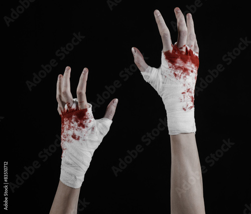 bloody hand in a bandage, bloody bandage, black background