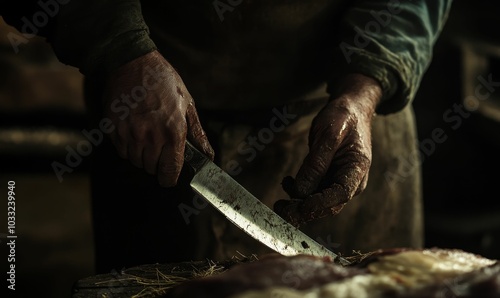 butcher, knife, blood, meat, hand, dark, work, messy, dirty, sharp, rustic, butchering, slaughter, farm, animal, harvest, abattoir, bloody, rural, vintage, tradition, primal, cutting, processing, leather, tool