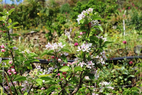 spring, apple tree, flower, bud, twig, apple, tree, blue, heaven, flower, stem, twig, leaf, fruit, flower, flowered, plant, sunlight, close-up view, garden, pretty, nature, shiny, flower head, flower garden, beauty, green, white, colourful, growth, vitality, sun, health, food, nobody, vertical