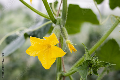 Blooming cucumbers. Flowers, leaves and young shoots of cucumbers.
