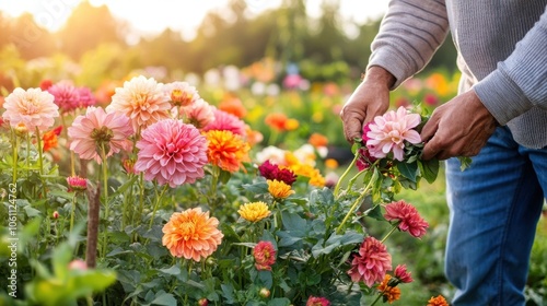 Blooming Dahlia Garden in Sunny Autumn Landscape