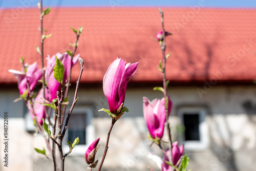 magnolia, flower, house, garden, floral, plant, flora, nature, landscape, flower, blooming, springtime, blossom, pink, bush, blossoming, beauty, bloom, spring, colourful, gardening, bud, magnoliaceae, leaf, fragility, flowering tree, sunny, fragrant, romance, magical, tender, elegant, exotic, seasonal, magenta