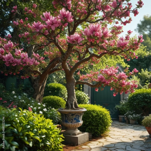 magnolia, tree, garden, flower, pink, blossom, spring, summer, bloom, nature, floral, beautiful, vibrant, colourful, sunlight, green, leaf, branch, potted plants, landscaping, botany, park, backyard, patio, path, stone, decorative, ornament, planter, peaceful, tranquil, serene, beauty, delicate, fresh, fragrant, spring flower, garden design, landscape design