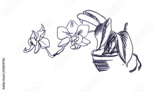 blooming orchid in a pot, black and white graphic sketch isolated on white background