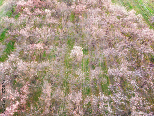 Blooming peach orchards in Uzbekistan, quadrocopter shooting