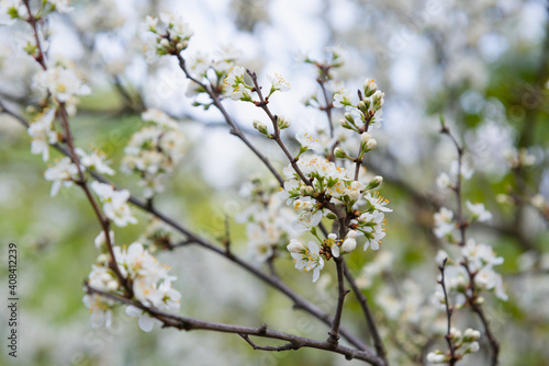 Blooming tree branch with white flowers. Spring flowers on cherry tree in sunlight