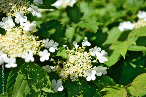 blooming viburnum tree in sunny day with clusters of white flowers, close-up