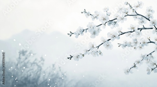 winter, snow, flower, blooming, branch, mountain, mist, fog, serene, dreamy, nature, landscape, white, blossom, floral, season, cold, peaceful, calmness, beauty, delicate, scenic, atmosphere, soft, light, elegant, purity, hope, renewal, christmas, new year, holiday
