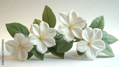 Blooming White Gardenia Flowers with Lush Green Leaves on White Background
