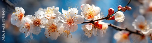 Blossoming apricot tree branches under blue sky with sunlight concept. Beautiful cherry blossom branches in full bloom against blue sky.