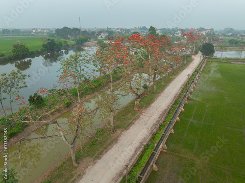 Blossoming Bombax ceiba tree or Red Silk Cotton Flower in Vietnam countryside