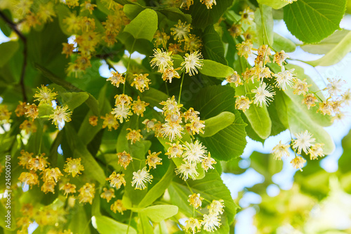 Blossoming linden branch in june day. Linden flowers background. Soft focus.